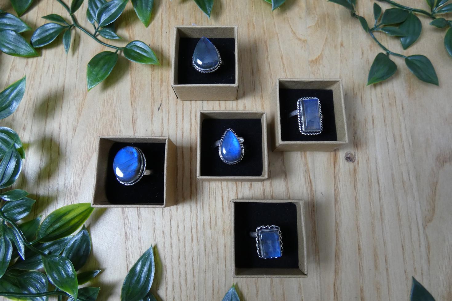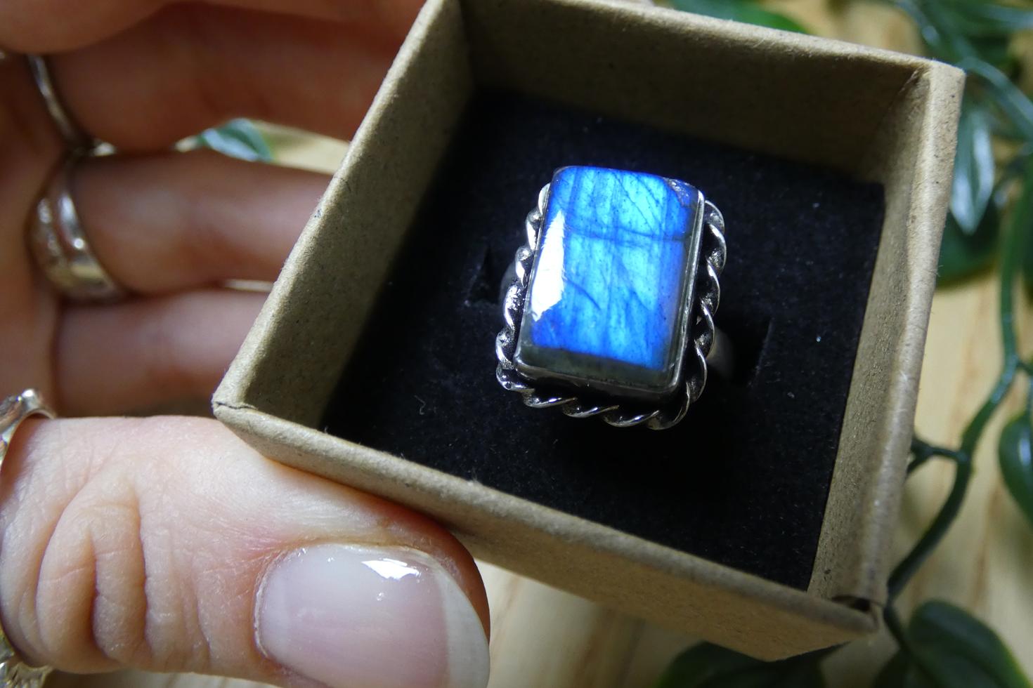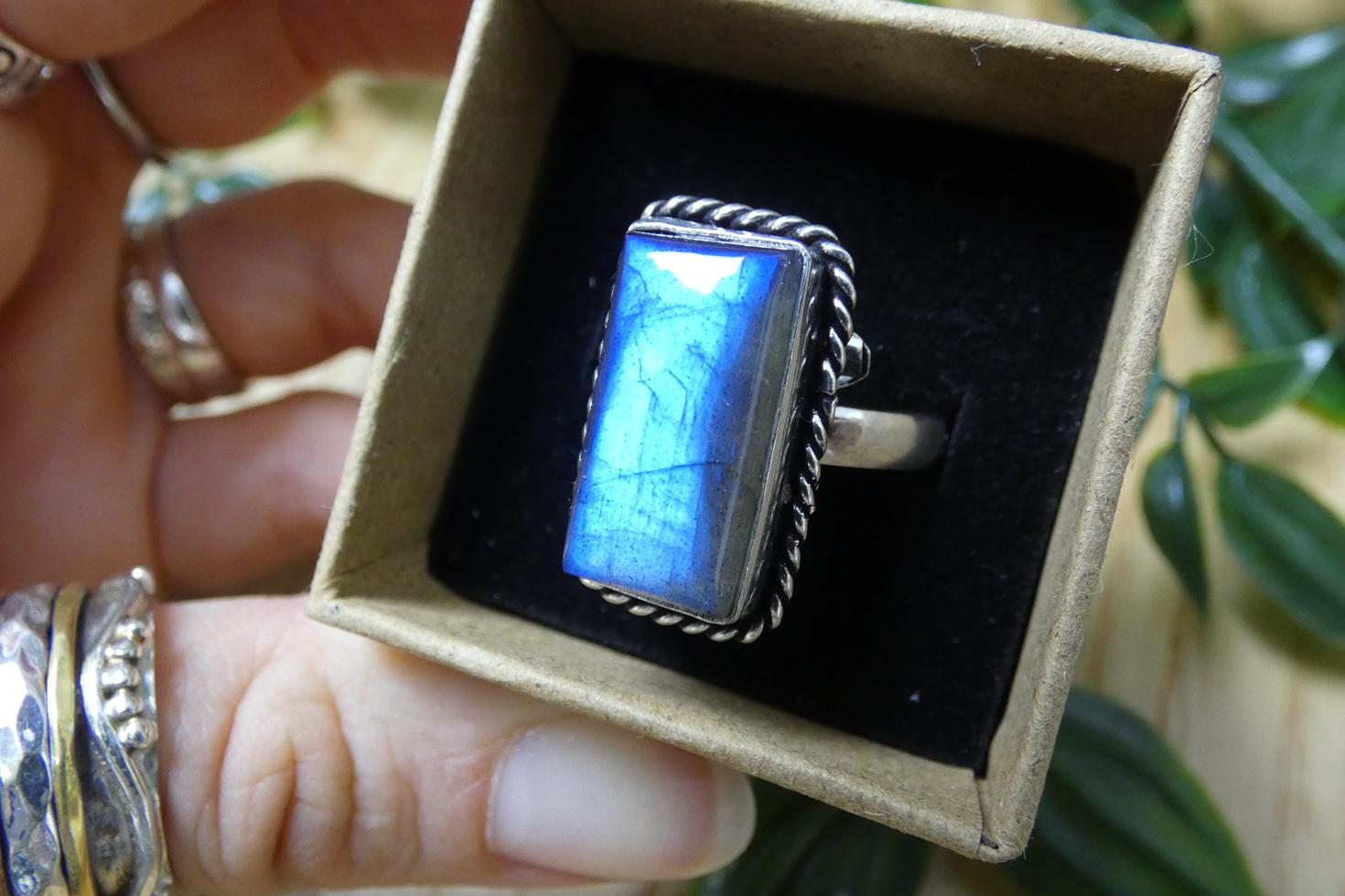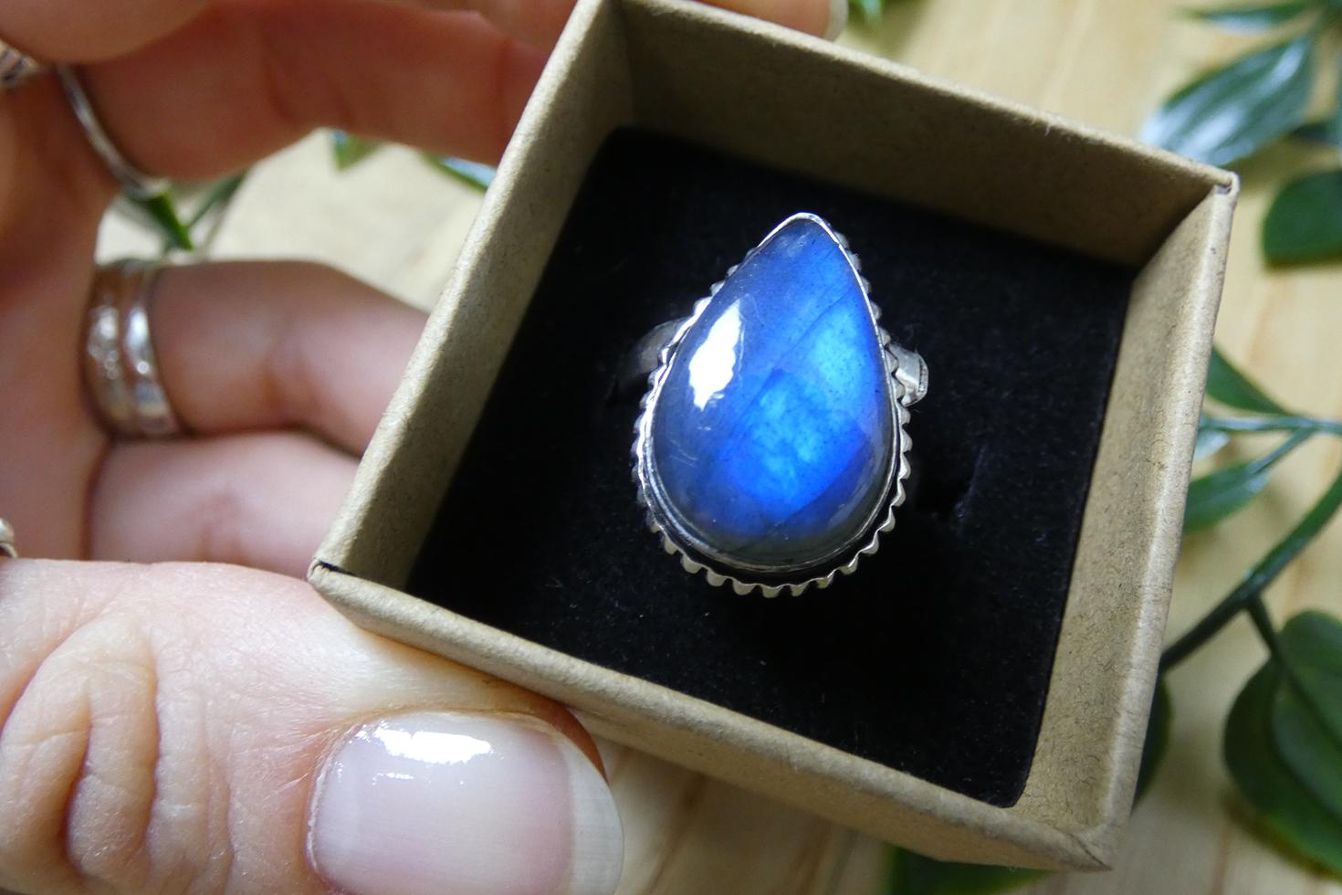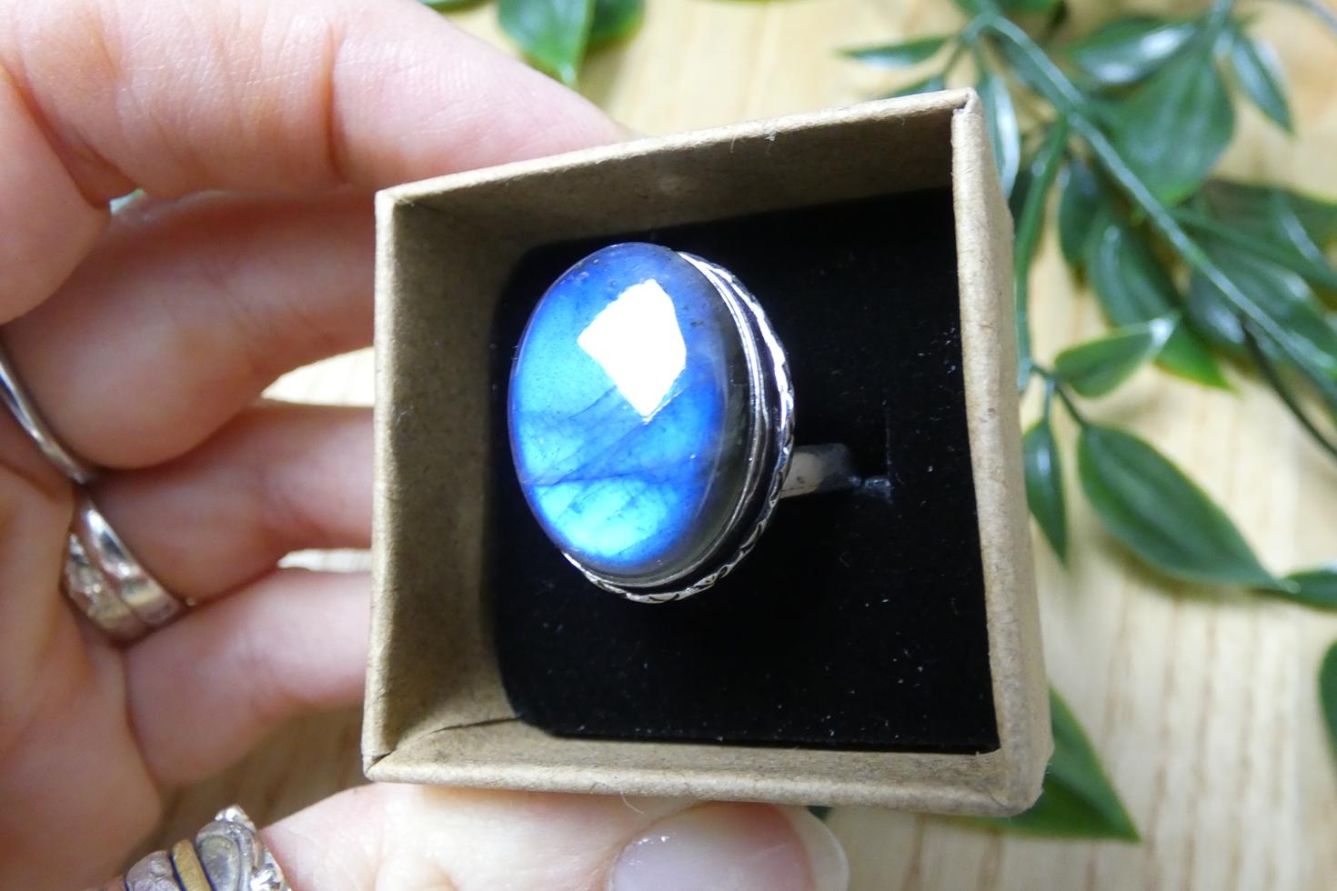 Materiali: Anello in argento 925 regolabile in stile etnico con labradorite blu di qualità a superficie liscia - made in India.