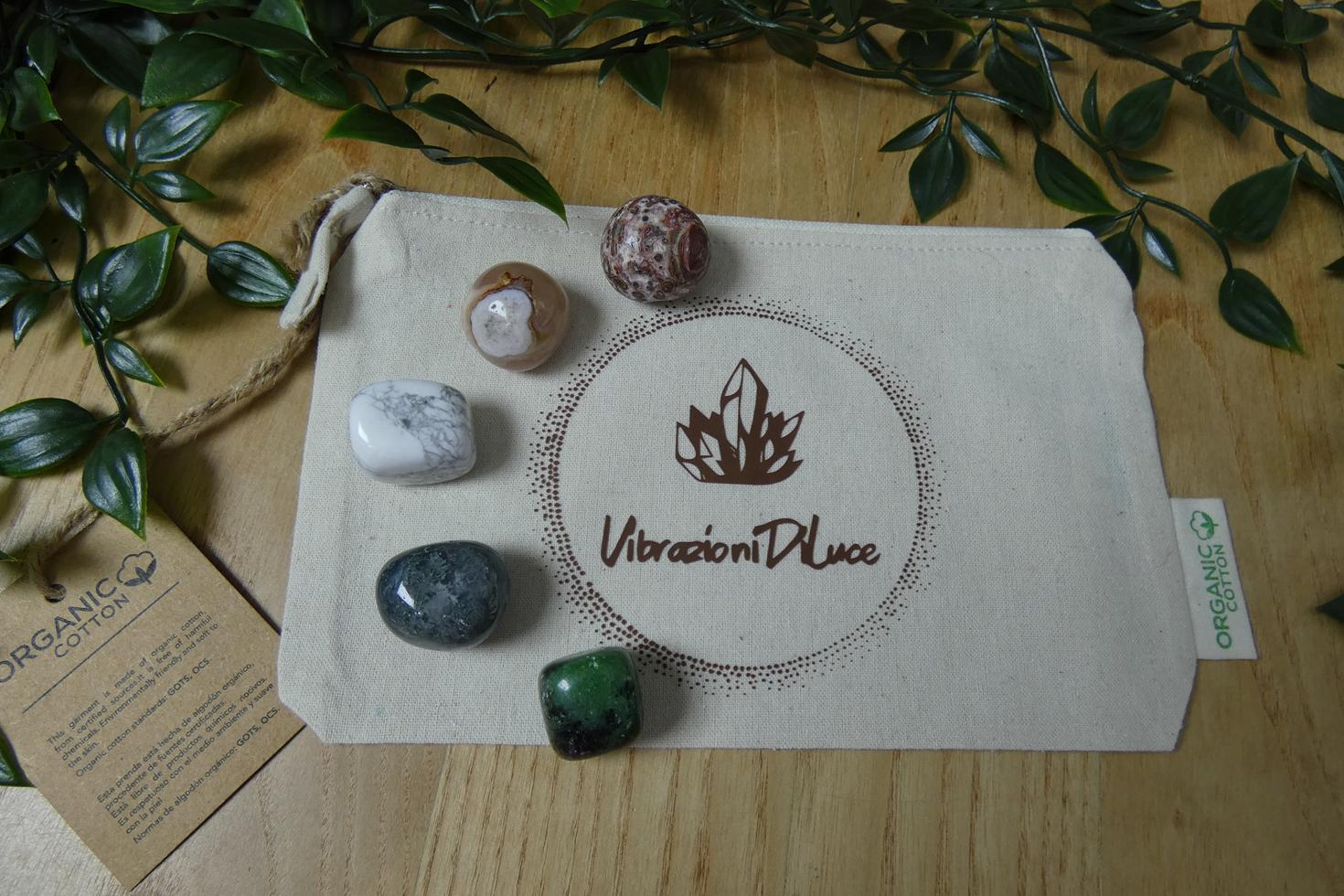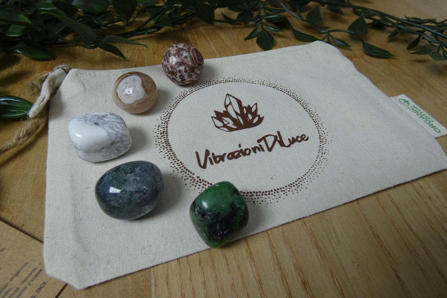 Acquistando il set, che sarà confezionato nel sacchetto in cotone Vibrazioni Di Luce, riceverai per ogni pietra il suo cartoncino riportante le proprietà specifiche. Questo fantastico set lavora principalmente sui chakra inferiori e sul chakra del cuore, e puoi utilizzarlo per gli auto-trattamenti di Cristalloterapia o per le tue sessioni di meditazione con i cristalli.