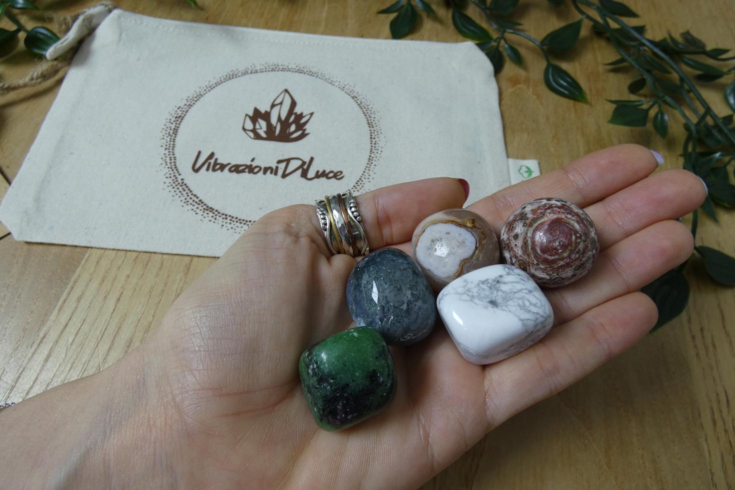 In questo bundle troverai delle pietre burattate di alta qualità che lavorano per attrarre calma e serenità in ogni ambito della tua vita, allontanando stress, ansie e pensieri: diaspro leopardo, agata sakura, howlite, agata muschiata e ruby in zoisite.