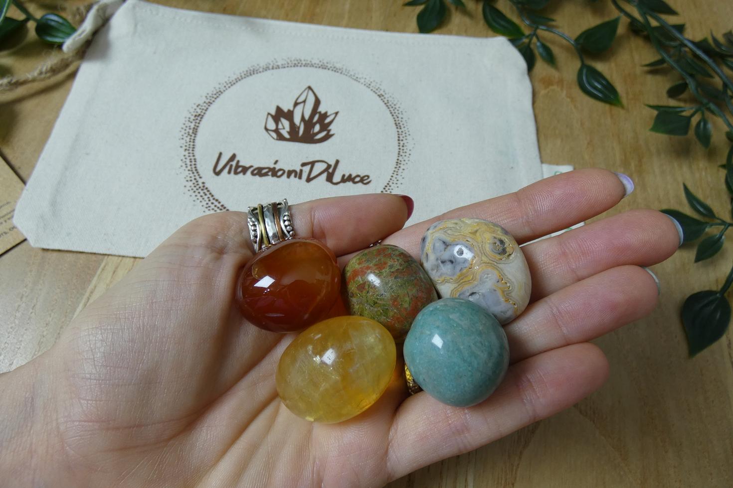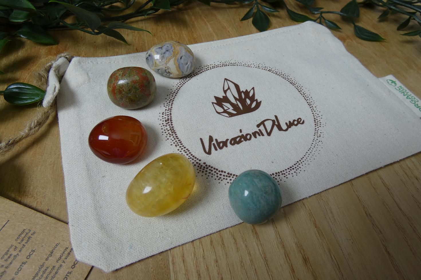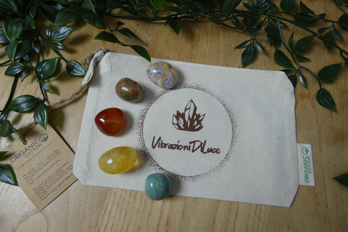 Acquistando il set, che sarà confezionato nel sacchetto in cotone Vibrazioni Di Luce, riceverai per ogni pietra il suo cartoncino riportante le proprietà specifiche. Questo fantastico set lavora principalmente sui chakra inferiori in particolare su secondo e terzo, ma anche sul cuore, e puoi utilizzarlo per gli auto-trattamenti di Cristalloterapia o per le tue sessioni di meditazione con i cristalli.