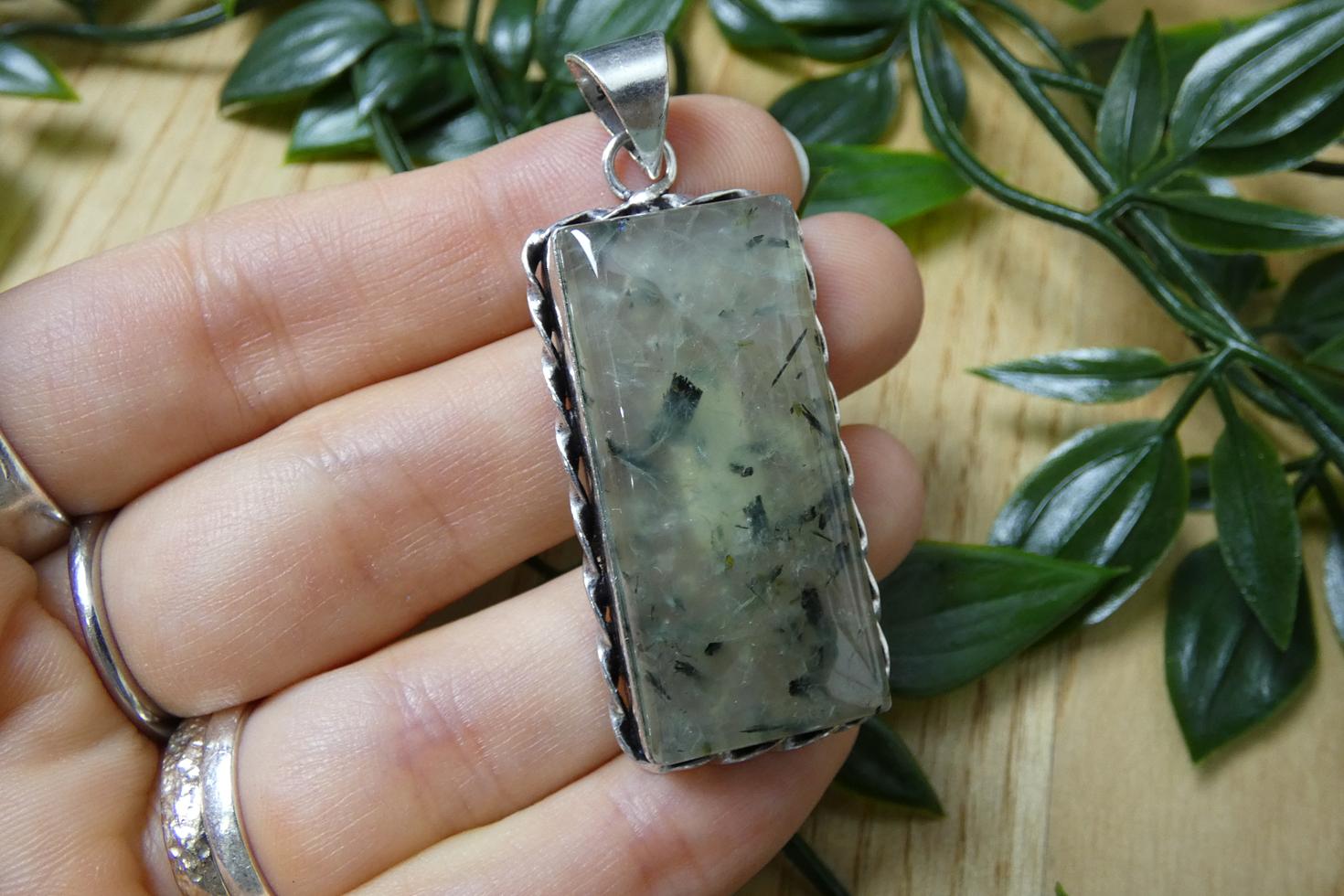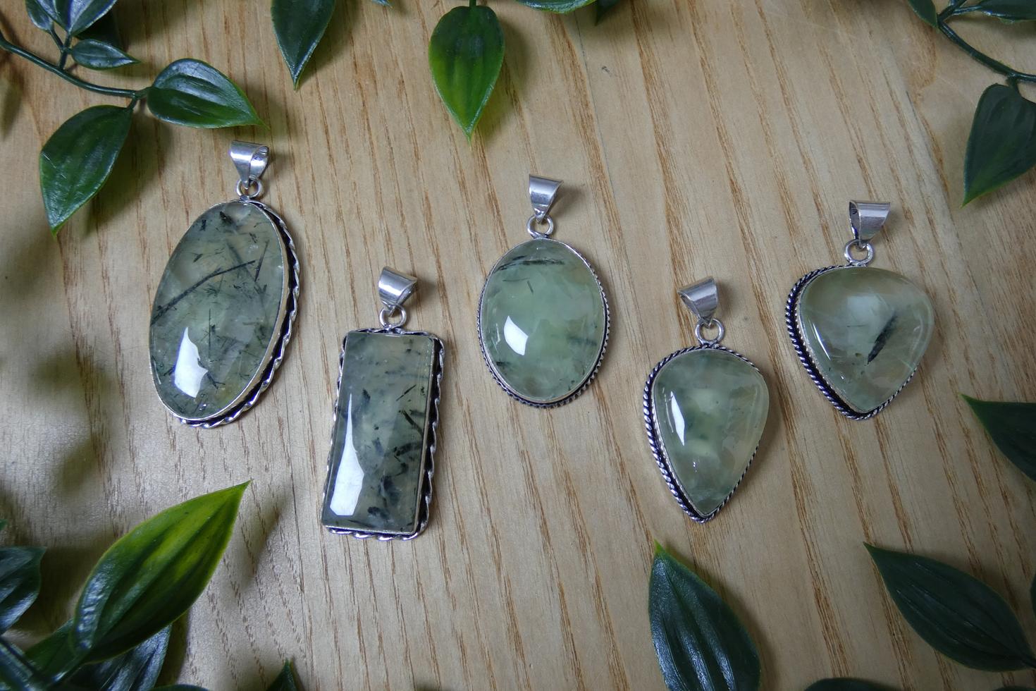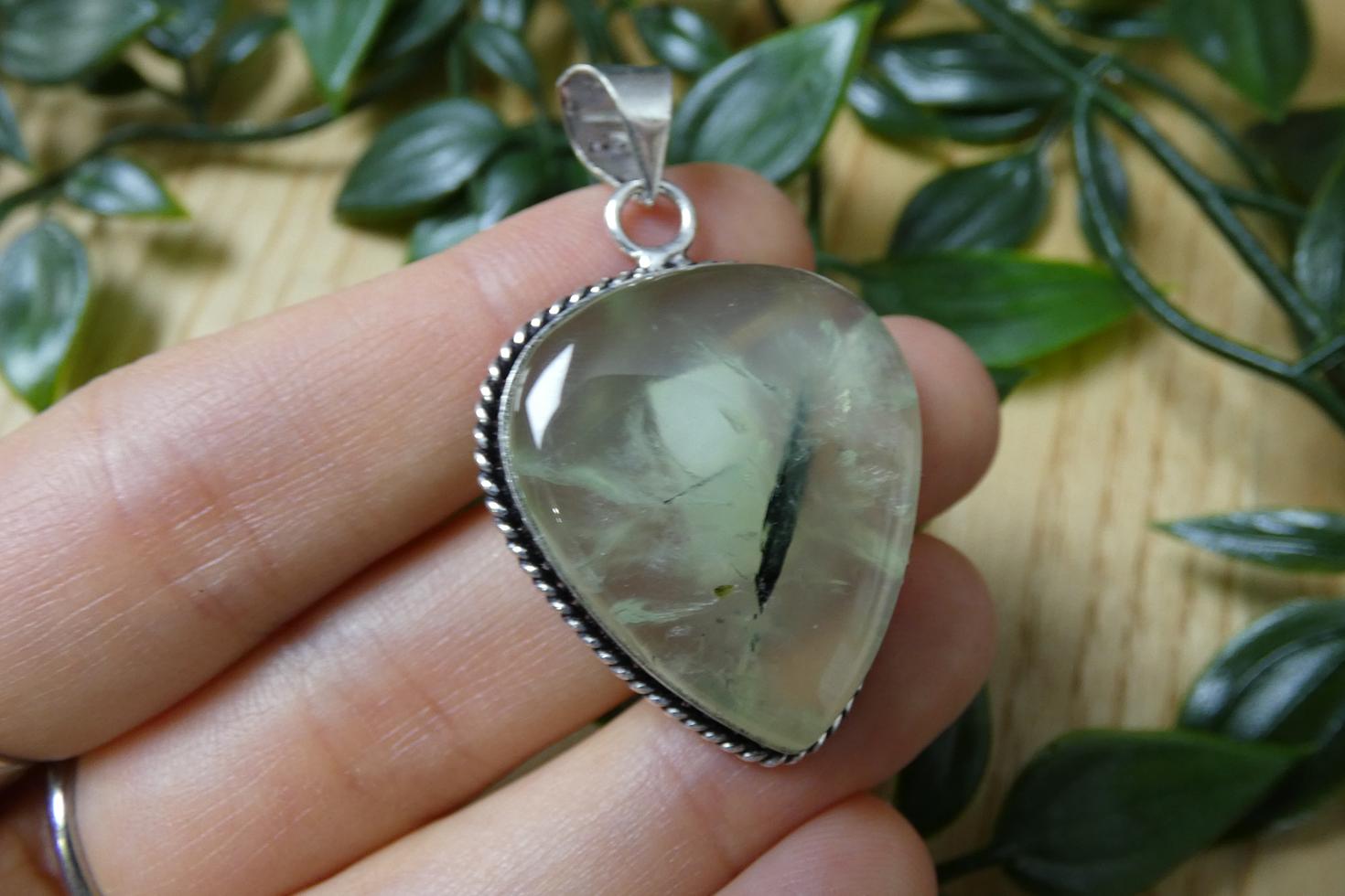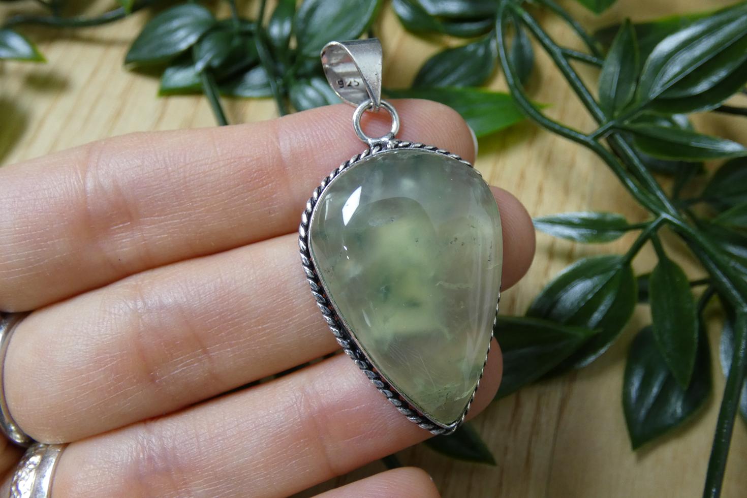Materiali: ciondolo in prehnite naturale a superficie liscia, incastonatura in argento 925.