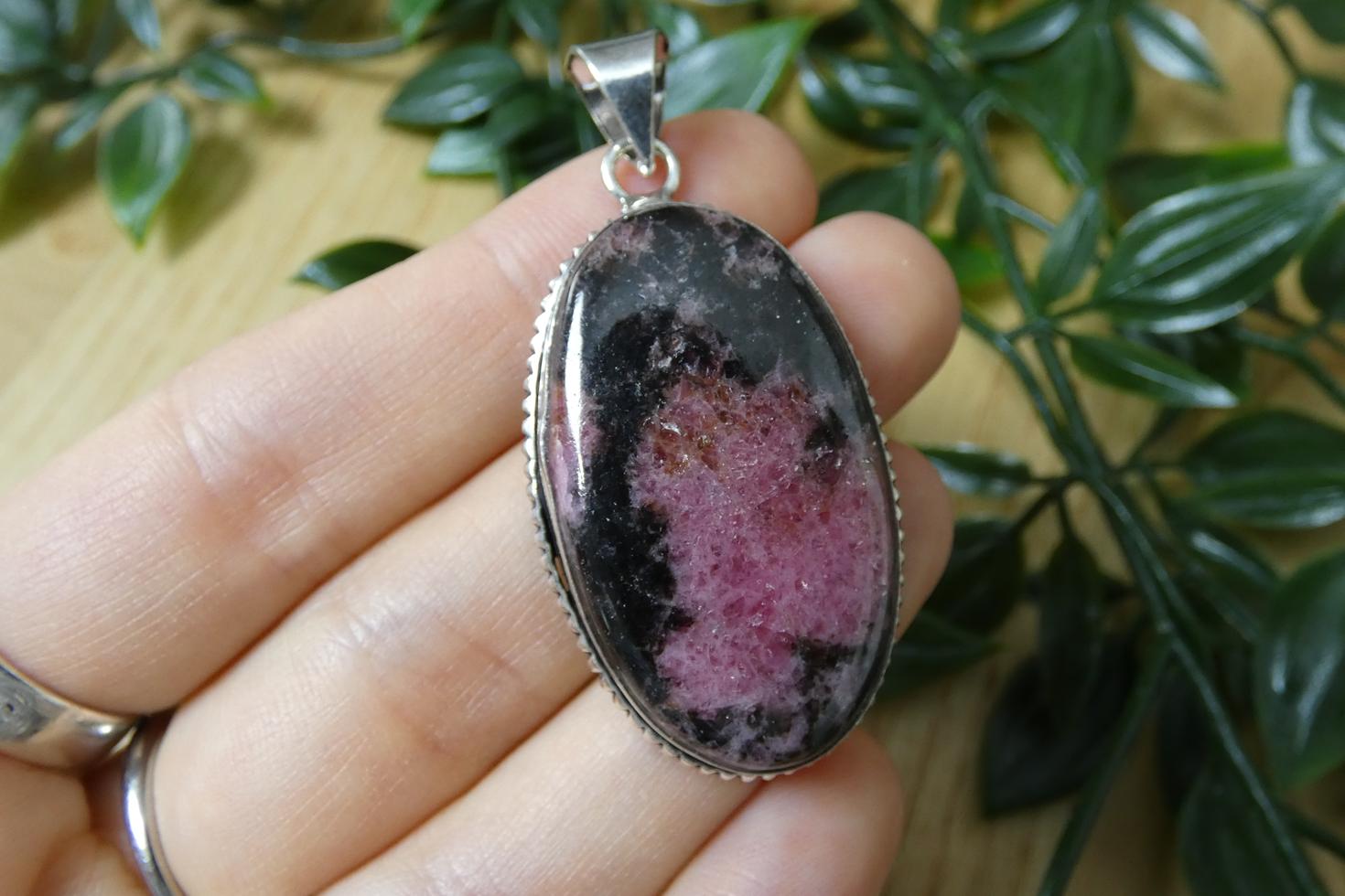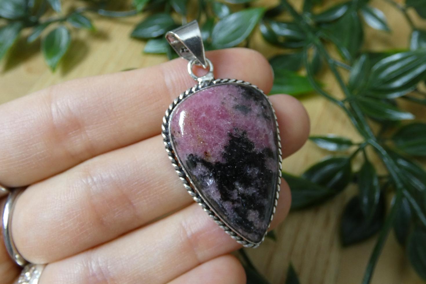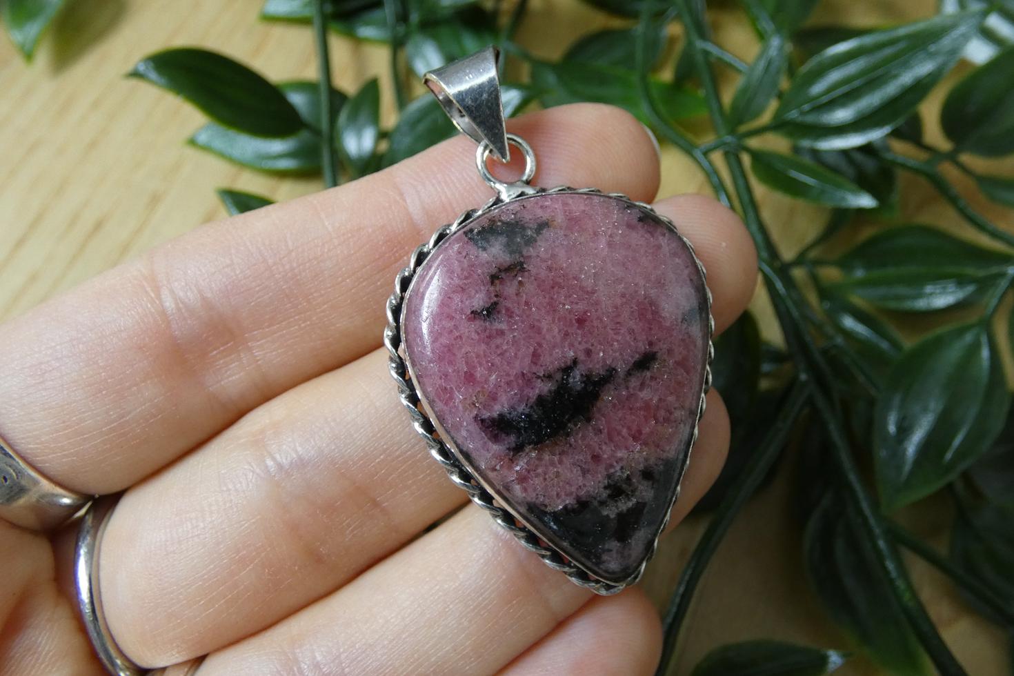 Materiali: ciondolo in rodonite naturale a superficie liscia, incastonatura in argento 925.