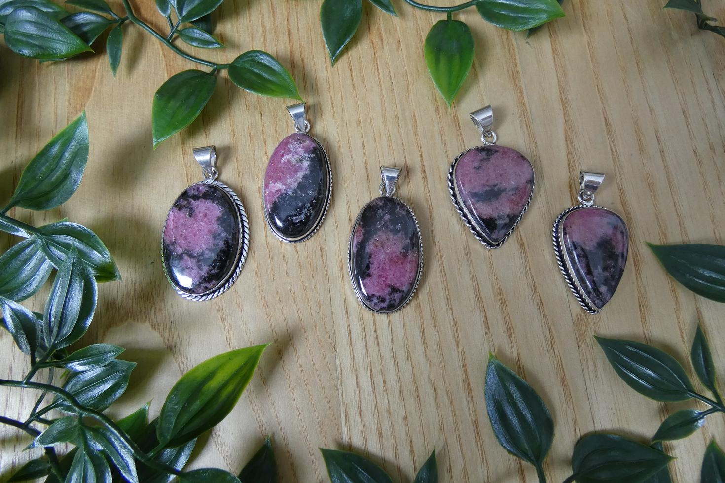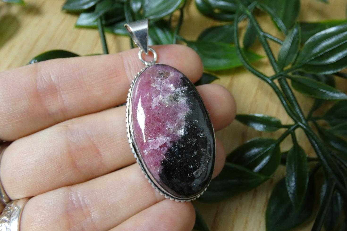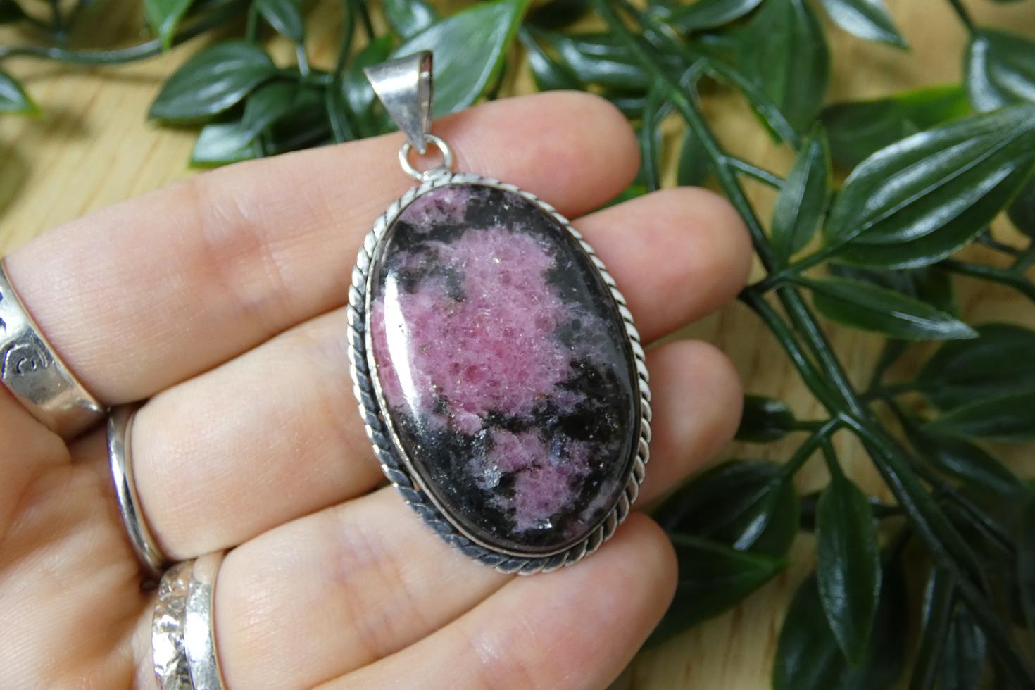 Materiali: ciondolo in rodonite naturale a superficie liscia, incastonatura in argento 925.