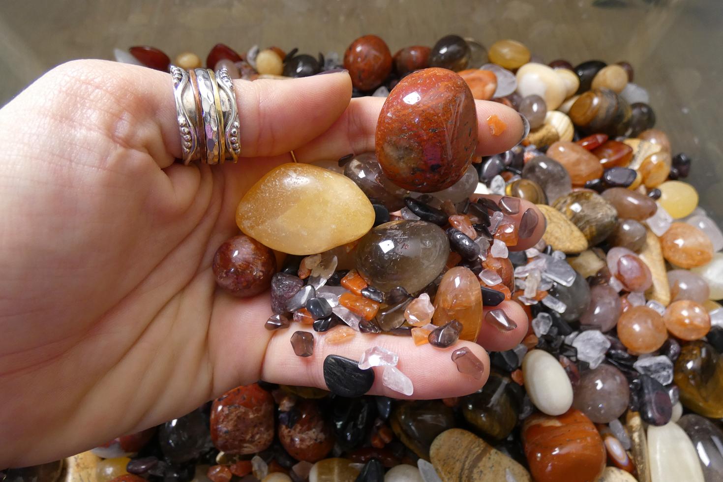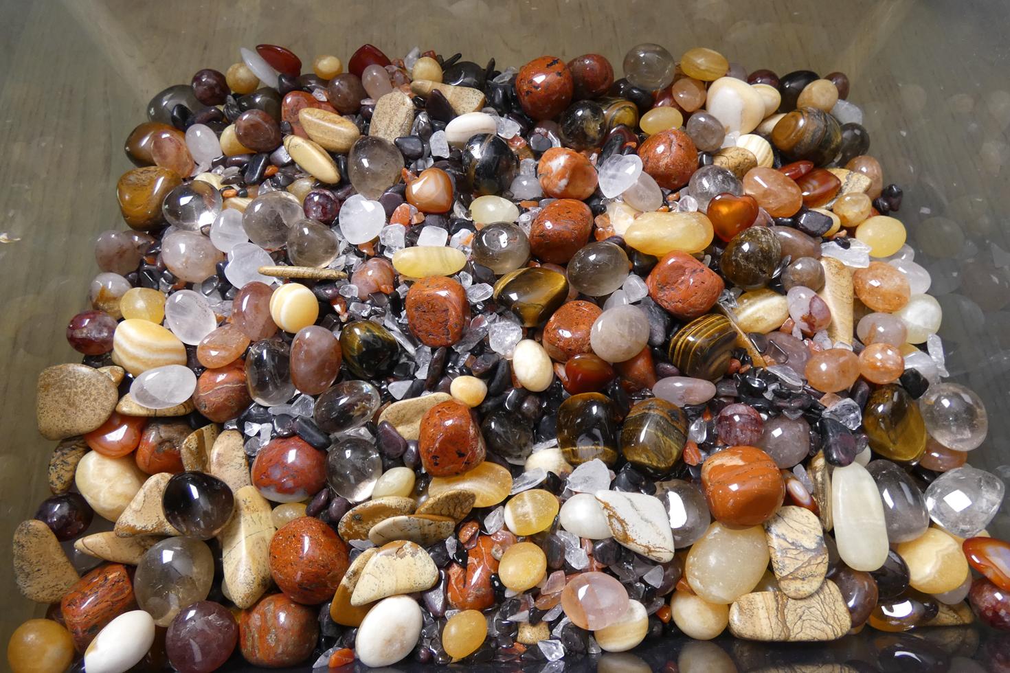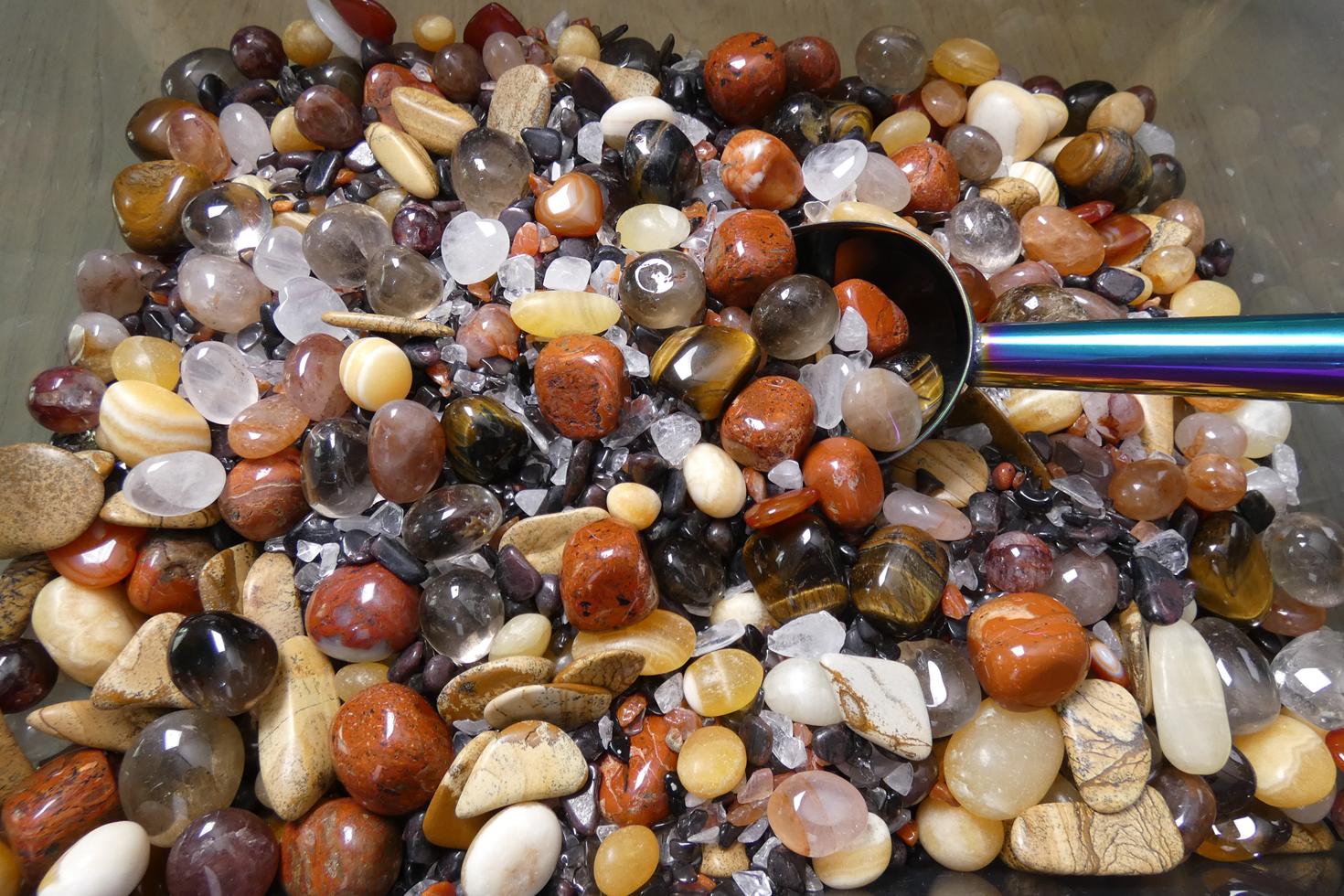 · burattate di quarzo fumè, occhio di tigre, diaspro rosso, quarzo ematoide, calcite arancio e diaspro paesaggio