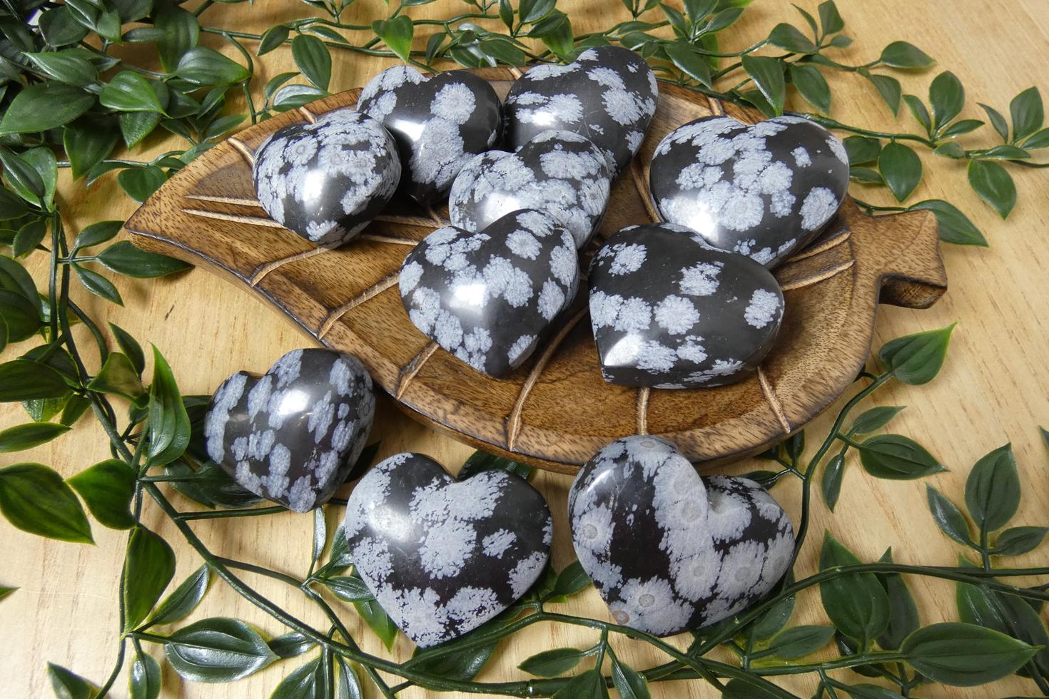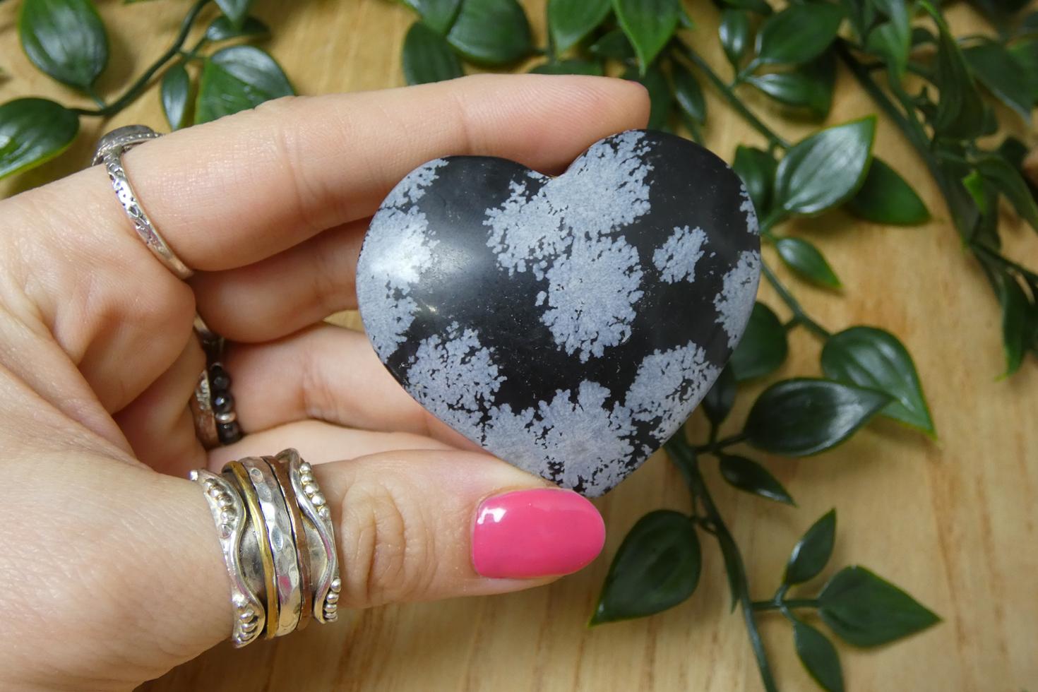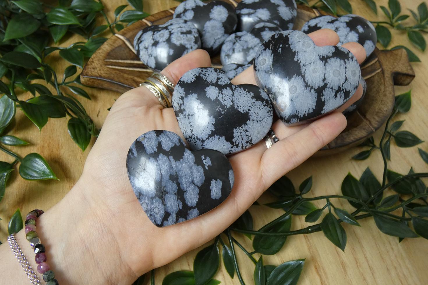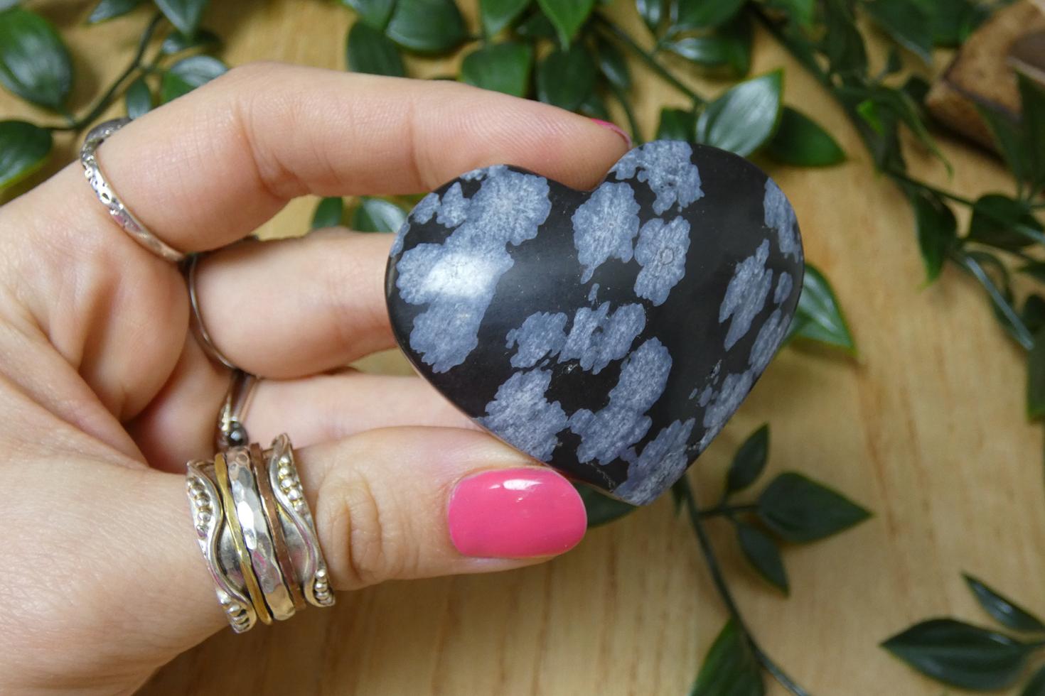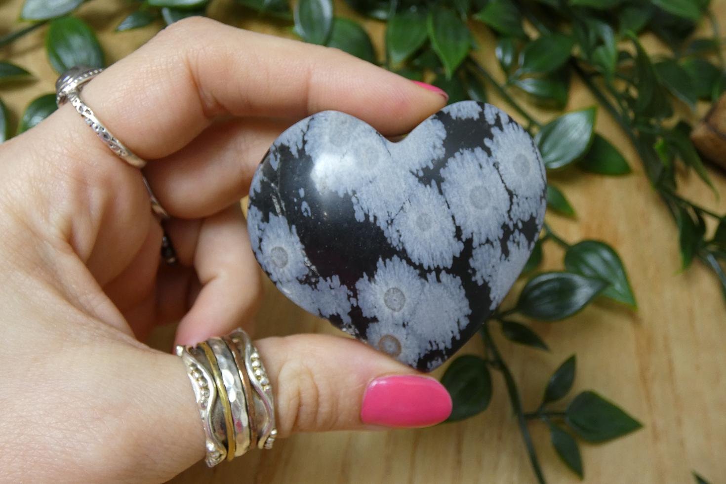 Descrizione e proprietà: L’ossidiana fiocco di neve è un tipo di ossidiana che ottiene i suoi "fiocchi di neve" dalle inclusioni del minerale bianco, la cristobalite. L'ossidiana fiocco di neve aiuta a portare le emozioni in superficie e ad esaminare i modelli di pensiero dannosi, cura i vecchi schemi karmici. Simbolizza il cielo notturno con le stelle brillanti, la luce che dissolve il buio. E’ legata alla purezza, al bilanciamento e all’equilibrio del corpo, della mente e dello spirito. Riduce lo stress e aiuta a comprendere il silenzio. Porta vigore nei periodi di cambiamento e serenità nei momenti di solitudine. Ti aiuta ad accettare le vibrazioni più elevate e fonda la tua energia spirituale sul piano fisico. Assorbe e disperde la negatività e aiuta a prevenire il drenaggio emotivo, è una pietra di protezione. Agisce sia sul 1° (radice) sia sul 6° (terzo occhio) chakra.