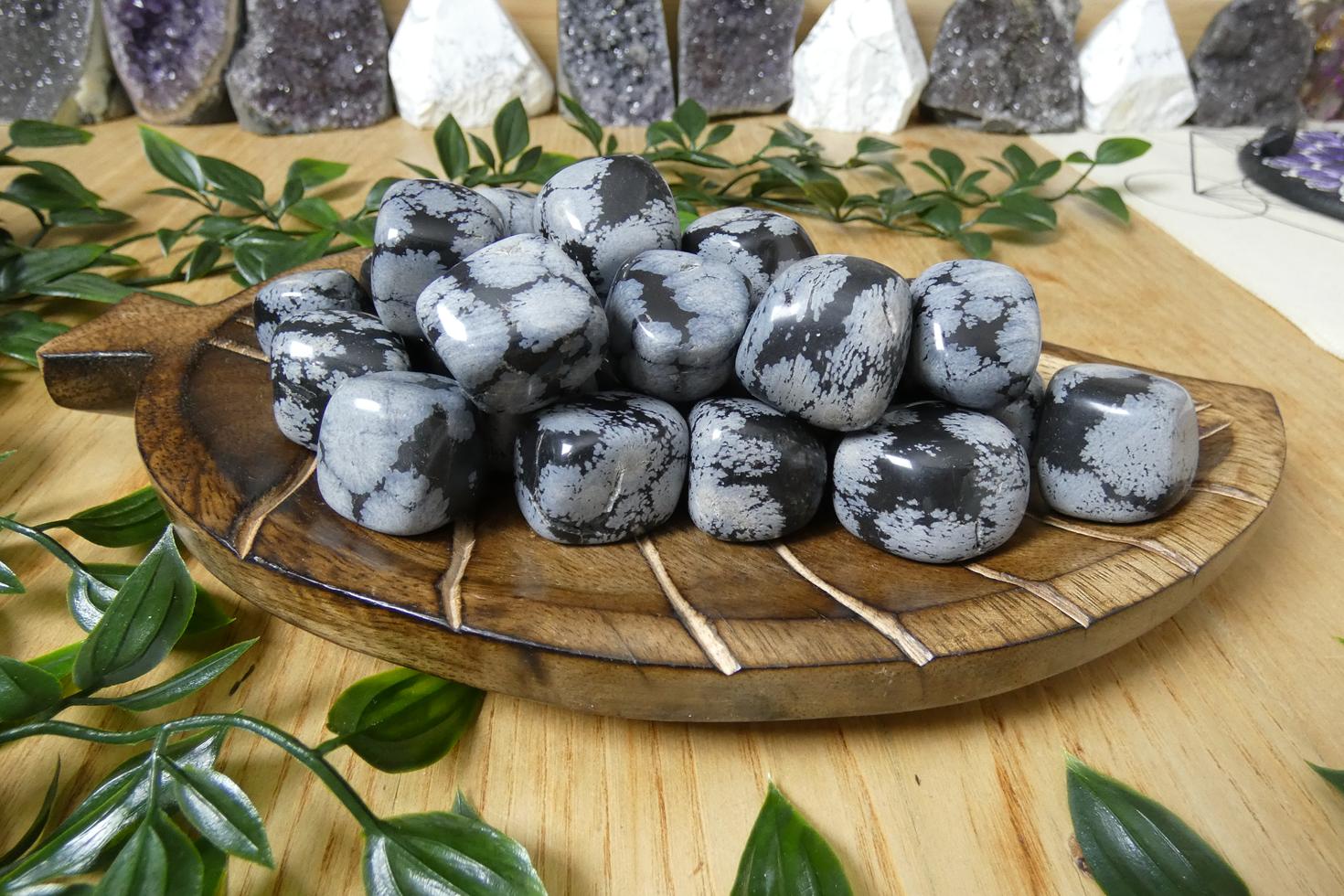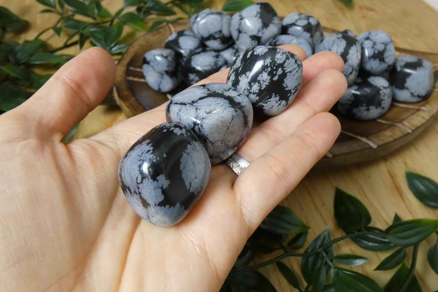 Descrizione e proprietà: L’ossidiana fiocco di neve è un tipo di ossidiana che ottiene i suoi "fiocchi di neve" dalle inclusioni del minerale bianco, la cristobalite. L'ossidiana fiocco di neve aiuta a portare le emozioni in superficie e ad esaminare i modelli di pensiero dannosi, cura i vecchi schemi karmici. Simbolizza il cielo notturno con le stelle brillanti, la luce che dissolve il buio. E’ legata alla purezza, al bilanciamento e all’equilibrio del corpo, della mente e dello spirito. Riduce lo stress e aiuta a comprendere il silenzio. Porta vigore nei periodi di cambiamento e serenità nei momenti di solitudine. Ti aiuta ad accettare le vibrazioni più elevate e fonda la tua energia spirituale sul piano fisico. Assorbe e disperde la negatività e aiuta a prevenire il drenaggio emotivo, è una pietra di protezione. Agisce sia sul 1° (radice) sia sul 6° (terzo occhio) chakra.