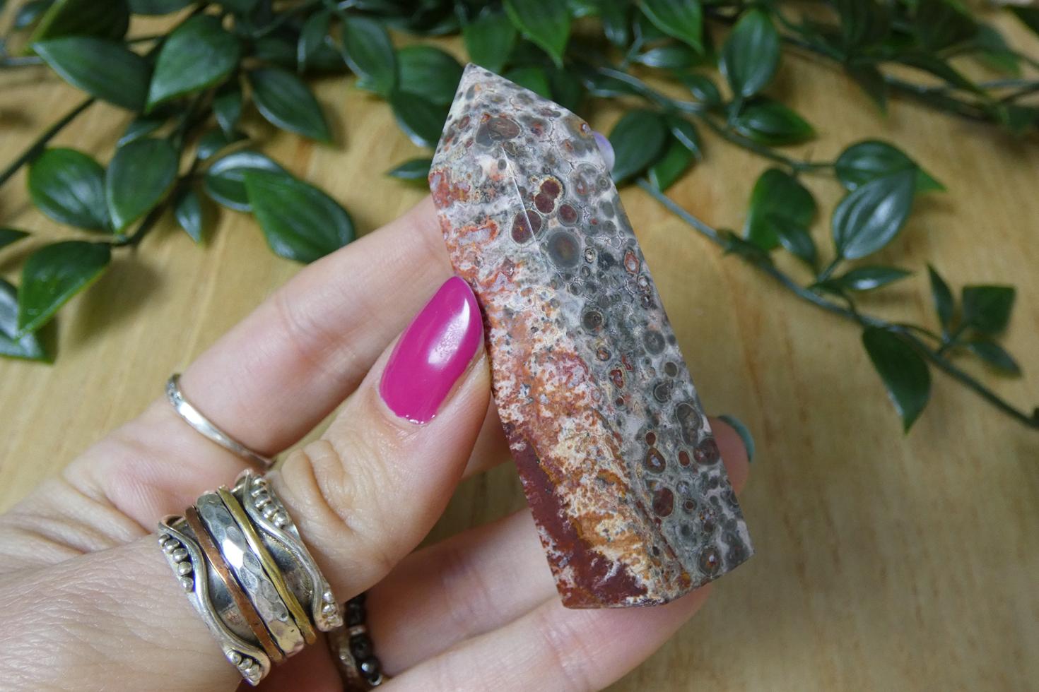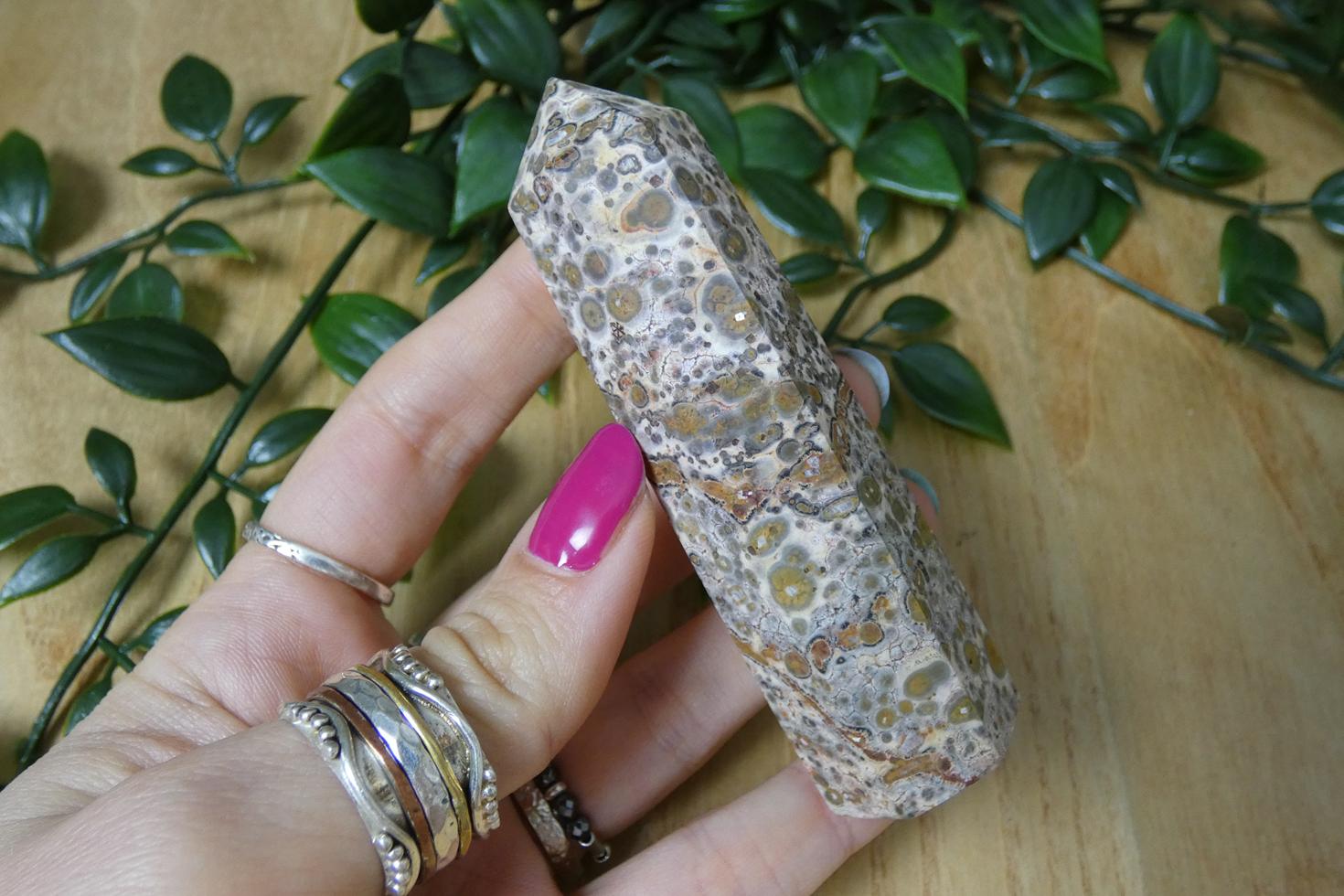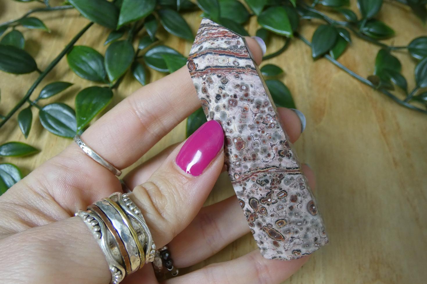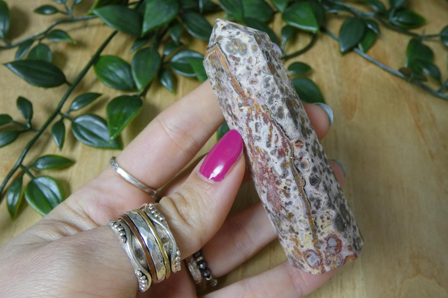Descrizione e proprietà: Il Diaspro Leopardo è una varietà di diaspro – famiglia del calcedonio - dall’aspetto “a pelle di leopardo”, caratterizzato da colori terrosi e neutri coperti di macchie circolari che ricordano appunto il manto del felino. Storicamente diverse culture hanno attribuito a questa pietra proprietà mistiche e curative, spesso associandola a protezione, forza e coraggio. E’ una pietra che risuona con i chakra inferiori e principalmente con il 1° chakra, che rafforza il nostro legame con la Terra e con la materia quindi il radicamento. Il Diaspro Leopardo aiuta a trovare il nostro equilibrio interiore e l’armonia, a potenziare le nostre capacità e l’autostima, e a seguire con fiducia il proprio percorso di crescita personale permettendone lo sviluppo in sintonia con la nostra vera natura. Può essere di aiuto per superare le paure e le situazioni di stress e stanchezza, e nell’affrontare i cambiamenti.