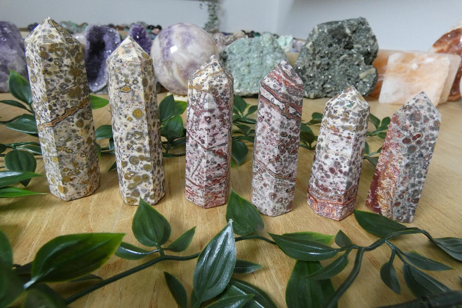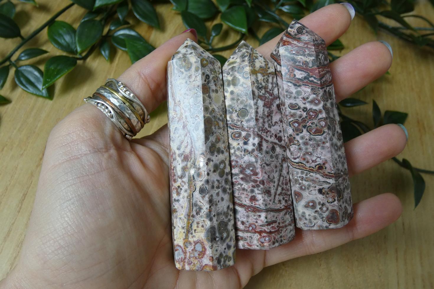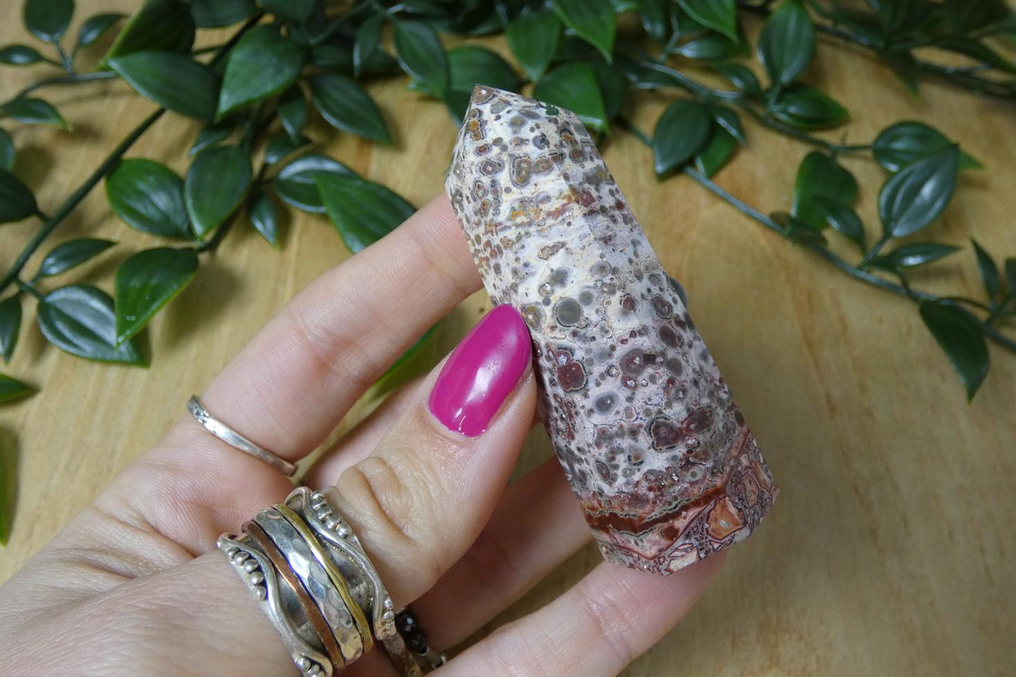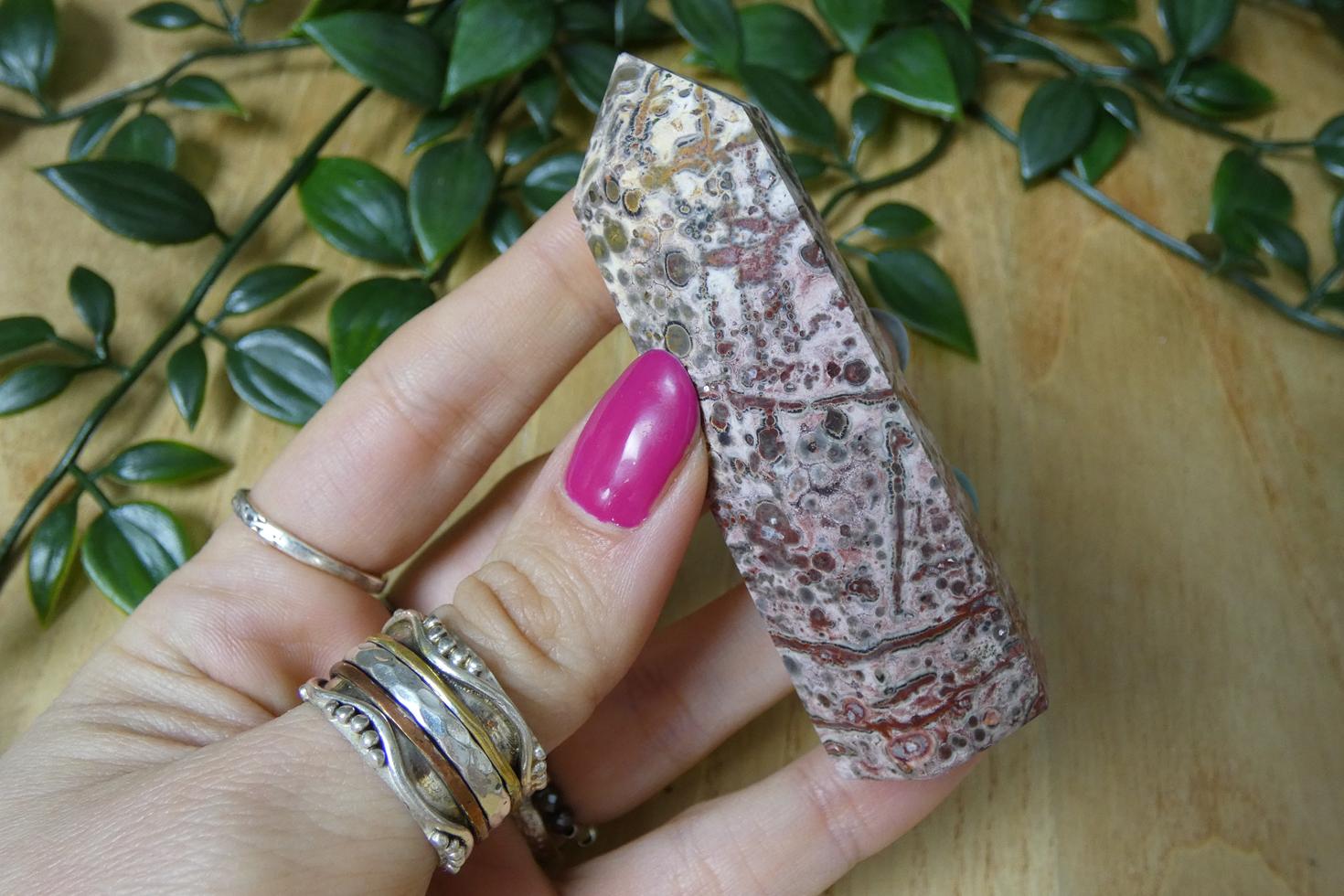 Descrizione e proprietà: Il Diaspro Leopardo è una varietà di diaspro – famiglia del calcedonio - dall’aspetto “a pelle di leopardo”, caratterizzato da colori terrosi e neutri coperti di macchie circolari che ricordano appunto il manto del felino. Storicamente diverse culture hanno attribuito a questa pietra proprietà mistiche e curative, spesso associandola a protezione, forza e coraggio. E’ una pietra che risuona con i chakra inferiori e principalmente con il 1° chakra, che rafforza il nostro legame con la Terra e con la materia quindi il radicamento. Il Diaspro Leopardo aiuta a trovare il nostro equilibrio interiore e l’armonia, a potenziare le nostre capacità e l’autostima, e a seguire con fiducia il proprio percorso di crescita personale permettendone lo sviluppo in sintonia con la nostra vera natura. Può essere di aiuto per superare le paure e le situazioni di stress e stanchezza, e nell’affrontare i cambiamenti.